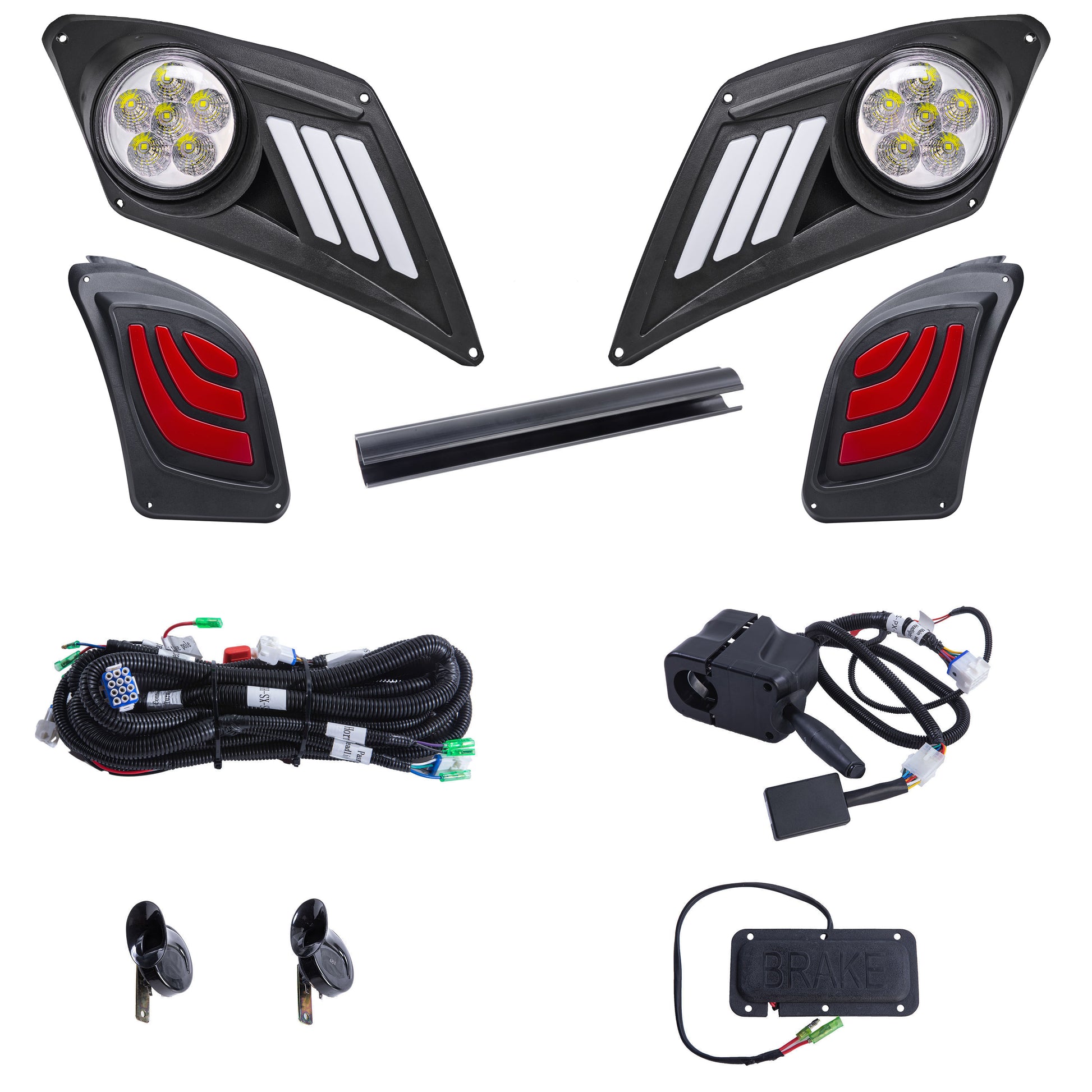 - Complete Kit Contents: Includes 2 LED headlights, 2 LED taillights, 1 upgraded wiring harness, 1 deluxe turn signal switch, 2 horns, 1 steering wheel cover, and 1 brake pad.